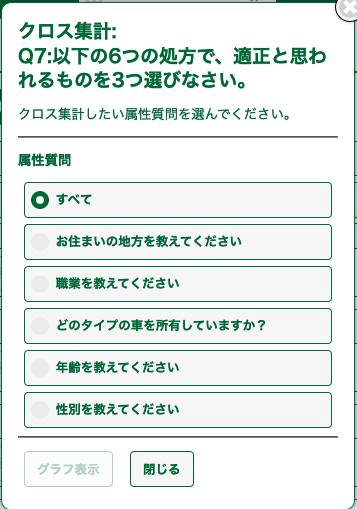 [クロス集計]のボタンをクリックすると、下記ポップアップが表示され、結果ページには、それぞれの属性ごとのグラフが表示されます。